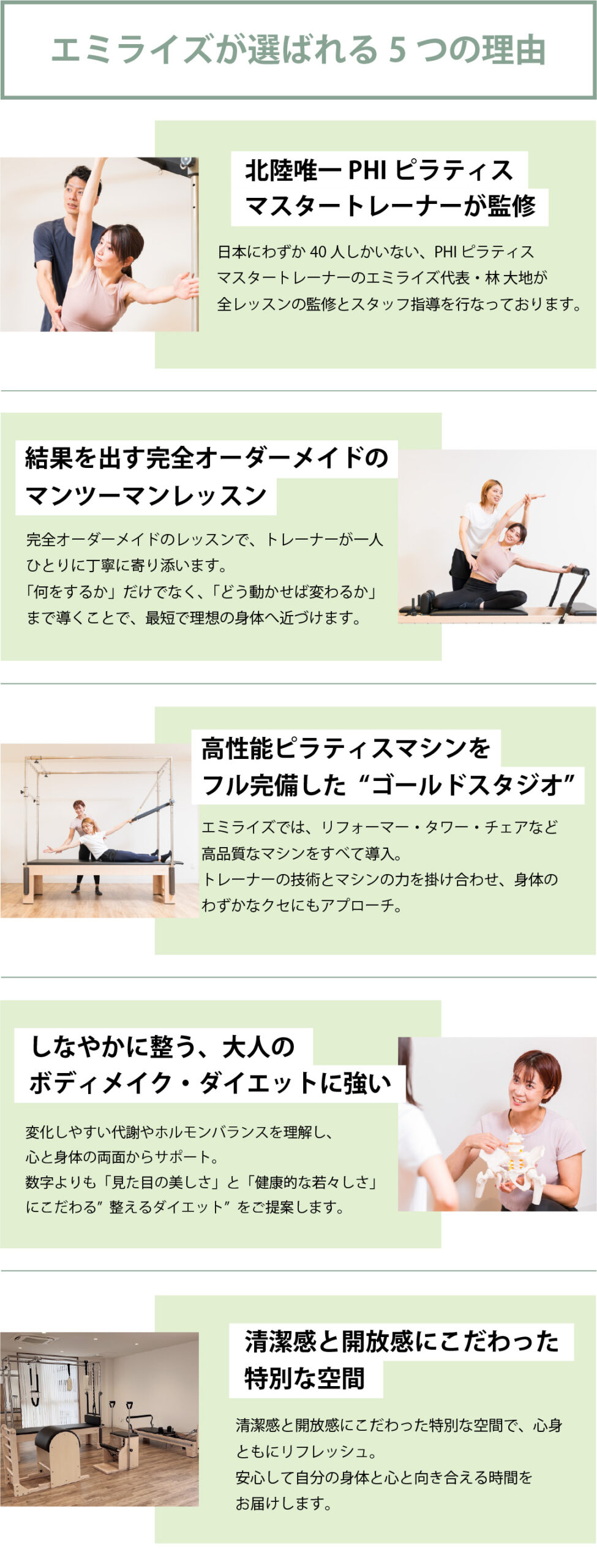 ご予約はこちら このような方におすすめです あなたに合った運動は?ヨガ・ピラティス・ジム徹底比較 パーソナルとグループの特徴解説 エミライズはマンツーマンのパーソナルレッスンを専門としており、あなたに合ったエクササイズを行うことで最短期間で効果を感じてもらうことを大切にしています! エミライズを漫画でご紹介 ご予約はこちら 店舗一覧 本店 金沢駅西店 天王寺店 お客様の声 お客様の声 ご予約はこちら 初回の流れ ご予約はこちら Q&A どれぐらいで効果が出ますか? 個人差があるため、正確に答えることは出来ませんが、根本的なカラダの変化には時間が必要だと考えています。特にダイエットに関しては継続的なトレーニングと適切な食事を摂って頂きます。初めは難しいと感じることもあると思いますが、運動初心者の方も含め、ダイエット成功率は92.8%となっております。 どのくらいの頻度で通えば良いですか? 最初の1ヶ月は週1~2回ほど通って頂き、体の状態に合わせて徐々に回数を減らしていきます。 身体に痛いところがありますが、トレーニングはできますか? 担当者は全て医療系国家資格保有者で、安全にトレーニングを行うことに長けています。症状を適切に捉えて、必要に応じて病院やクリニックの受診をおすすめすることがあります。その場合、お医者様とタッグを組んで進めていくので、安心してご利用いただければと思います! 運動未経験者でも大丈夫ですか? 8割の方が未経験の方ですが安心してご利用いただけます。カウンセリング、姿勢・動作のチェックを行い、カラダの状態に応じて一人一人にあったトレーニングプログラムで進めていきます。 予約は必要ですか? 当スタジオは、完全予約制となっております。LINEにてお問い合わせください。 クレジットカードは使えますか? はい、ご使用できます。お会計はクレジットカードのみとなっており、現金はご利用なれません。 店舗一覧 北陸 石川県 本店 金沢駅西店 関西 大阪府 天王寺店