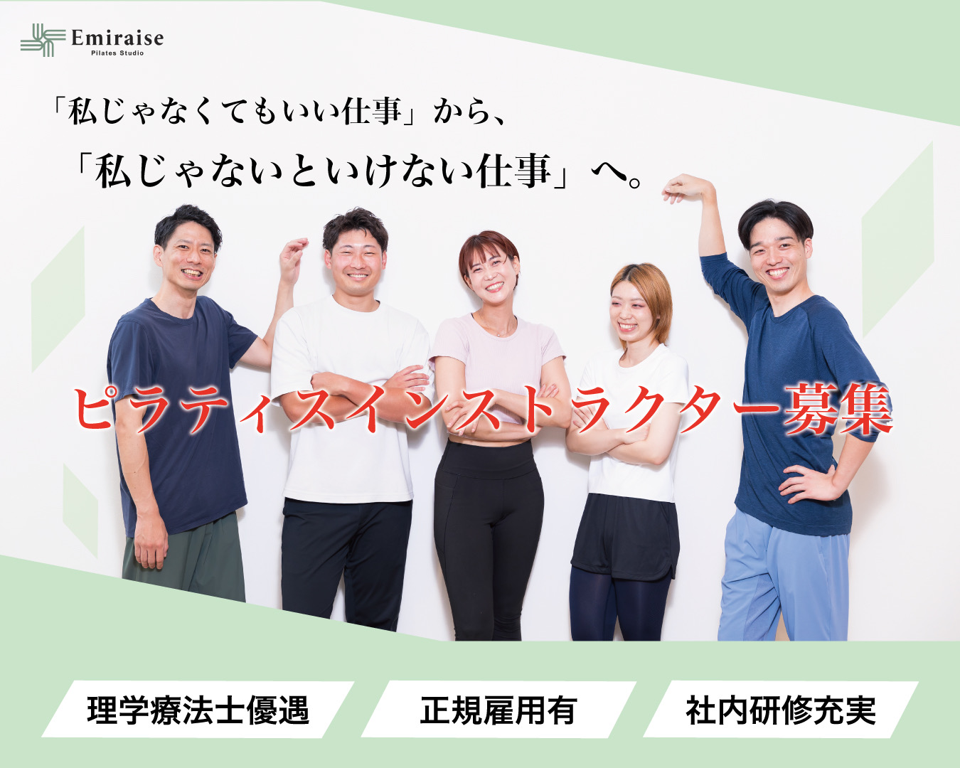 実際にピラティスを体験したところ、私自身がピラティスを好きになり継続して通っていました。そんな中ピラティスを通して理想な身体づくりを提供する側になりたい!と思い、エミライズで働きたいと思いました。